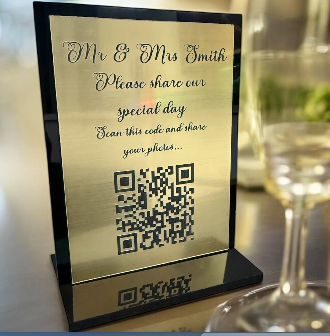 Personalised Wedding Day Shoot and Share, Table QR Stands with engraved text.